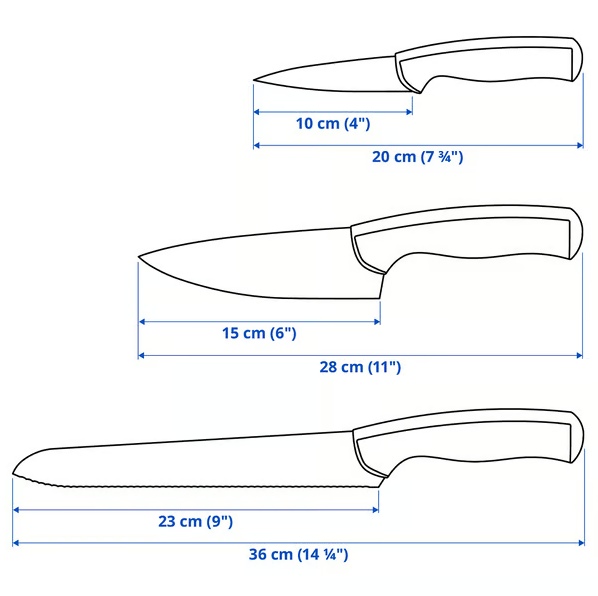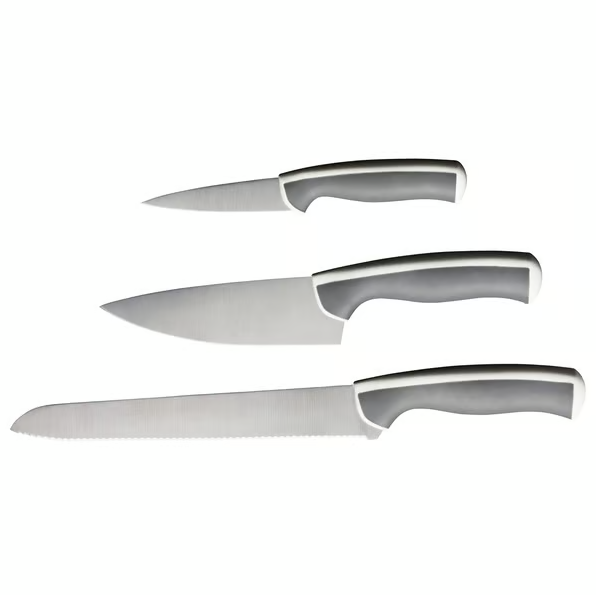 Рубить, нарезать кубиками и ломтиками – с помощью этих трех ножей в удобном наборе вы сможете готовить вкусные блюда для себя и своей семьи. Эти ножи прочные, устойчивые и недорогие, что выгодно как на кухне, так и в вашем кошельке.
