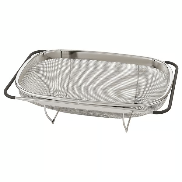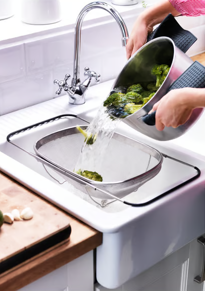Промыть салат или процедить воду после варки макарон очень просто с помощью этого дуршлага из нержавеющей стали, который легко подвешивается над раковиной благодаря регулируемым ручкам.